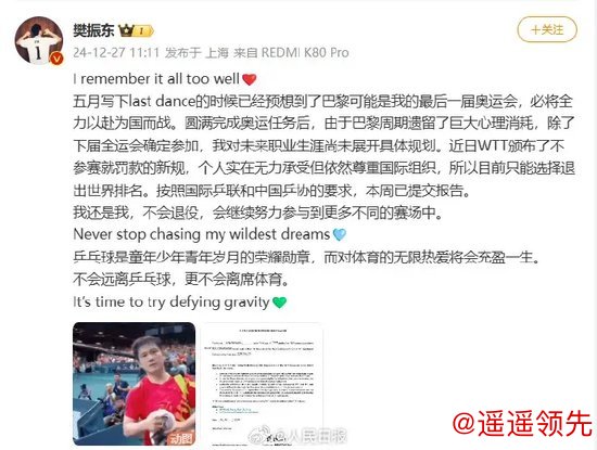 他在社交媒体上表示自己会退出世界排名,并已向国际乒联和中国乒协提交相关报告。